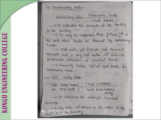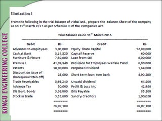 4. Illustrative examples are provided of balance sheet preparation from trial balance details for different companies. Accounting ratios and limitations of financial statements are also briefly covered.