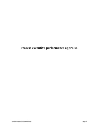The document outlines a comprehensive job performance evaluation form specifically for process executives, detailing performance factors, evaluation methods, and rating definitions. It provides guidelines for assessing various competencies, such as decision-making, teamwork, and communication, while offering links to additional appraisal resources. Multiple performance appraisal methodologies are discussed, including Management by Objectives (MBO) and 360-degree feedback, aimed at fostering accurate and constructive employee evaluations.