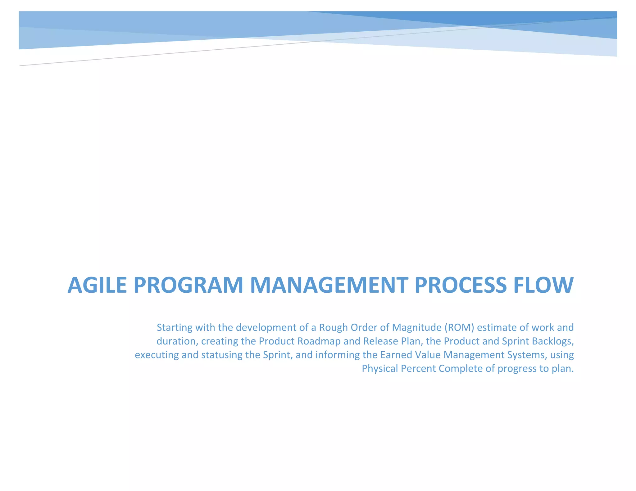 The document outlines an agile program management process flow, detailing the steps from developing a rough order of magnitude (ROM) estimate to executing sprints and managing backlogs. It emphasizes the importance of customer collaboration, product prioritization, and continuous updates throughout the product development lifecycle. Additionally, it integrates agile methodologies with earned value management to measure progress and performance effectively.