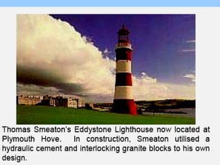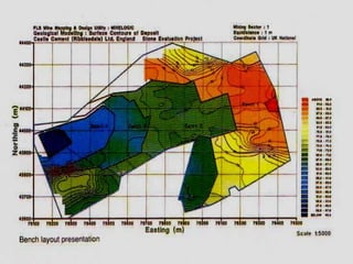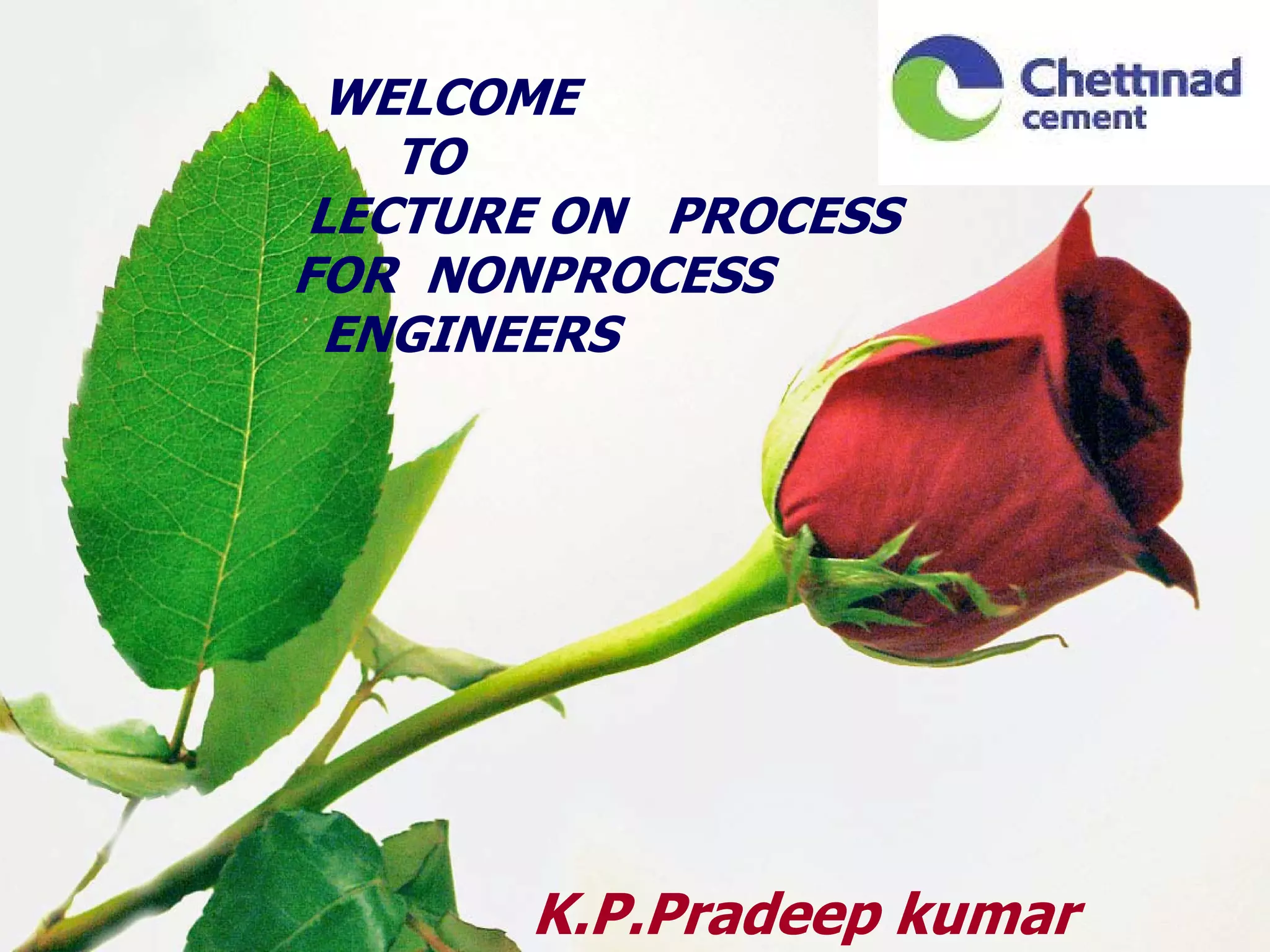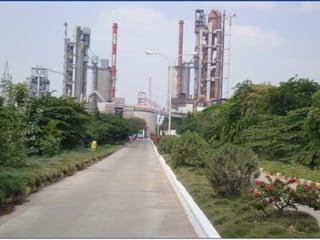 The document provides information about the cement manufacturing process. It begins with defining what cement is and providing a brief history of cement. It then discusses the key raw materials used, including limestone, shale, and iron oxide. The document outlines the main process steps of cement production, including mining, crushing, blending, pyroprocessing in a kiln to form clinker, clinker cooling, cement grinding, and packaging. It also discusses factors that influence cement quality such as raw material composition and burning conditions. Overall, the document provides a high-level overview of the cement production process from raw materials to the final product.