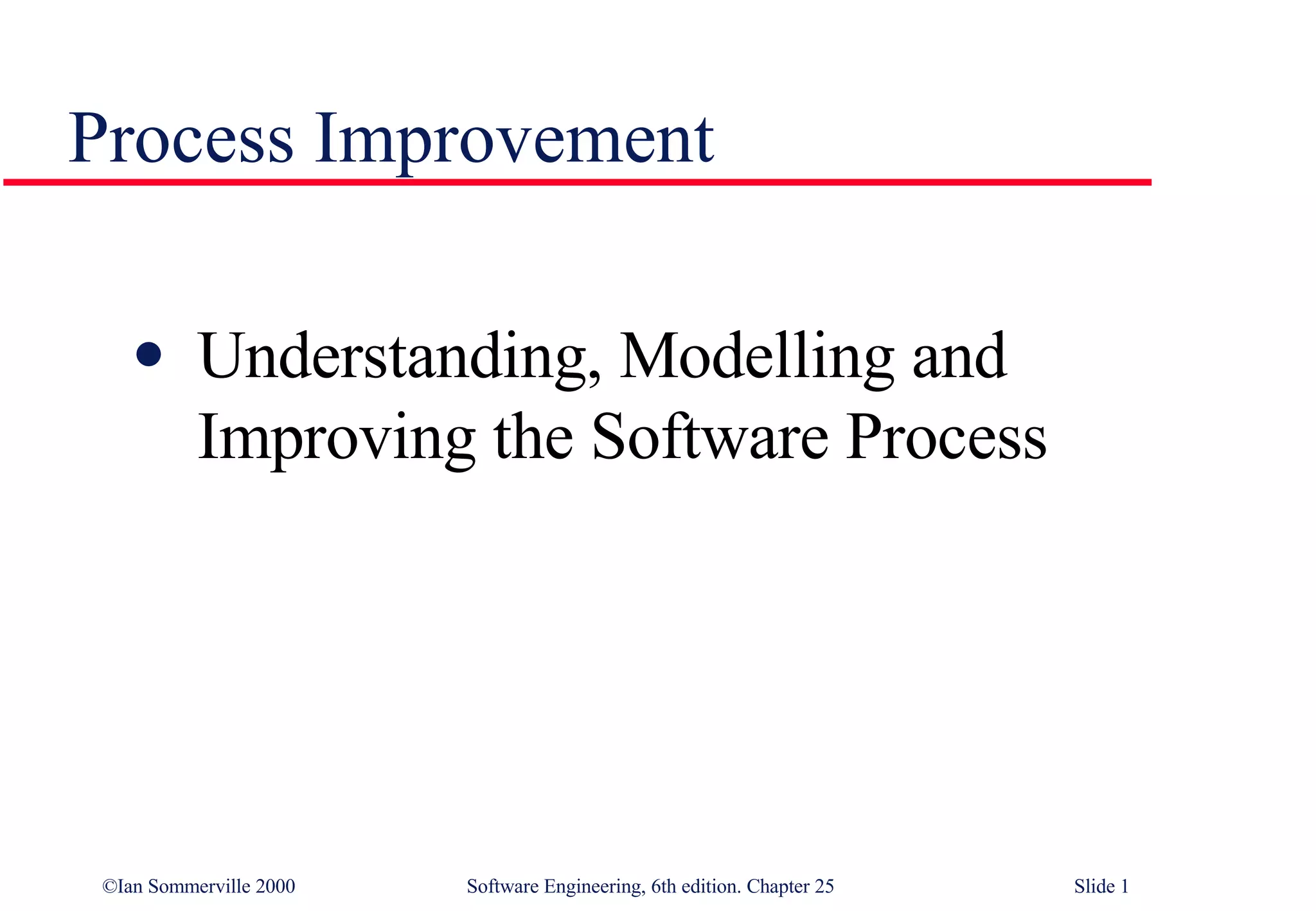The document discusses software process improvement. It explains the principles of process improvement and introduces the SEI Capability Maturity Model. It discusses process analysis, modeling, measurement, and classification. It addresses the applicability and limitations of the SEI model and different process choices based on factors like project size.