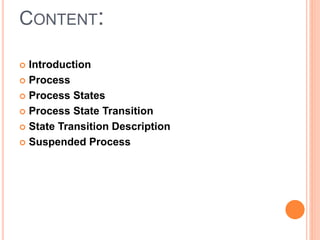This document discusses processes and process states in operating systems. It defines a process as a program in execution that can exist in different states. The main states are new, ready, running, blocked, and terminated. A process can transition between these states, such as moving from ready to running when assigned CPU resources or from running to blocked when waiting for a required resource. An additional suspended state is used when a process is swapped out of memory. The document provides detailed descriptions of each state and the transitions between them.
