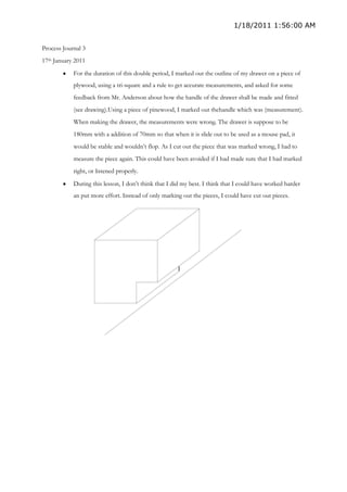 The document describes a student's process journal entries from woodworking lessons. Over multiple lessons, the student cut out and shaped a wooden drawer and base. Key steps included measuring and cutting the base, marking and cutting out the drawer space, sanding edges, screwing on the drawer handle, and adding a piece of wood to secure the drawer in place. The student reflected on progress each lesson and identified areas for improvement, such as working more efficiently with the time given.
