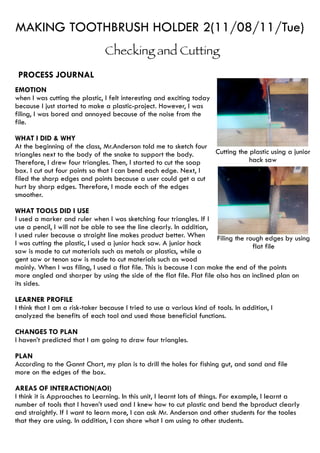 2) Further filing, cutting, and drilling is done. The student reflects on safety practices.