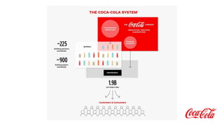 The document describes the manufacturing process of Coca-Cola products. It involves several steps: 1) pure water is filtered and treated, 2) sugar and concentrate are added to produce syrup, 3) the syrup is carbonated under pressure to produce fizz, 4) machinery fills and seals bottles and cans precisely, 5) labels and codes are applied, 6) final checks are made before packing and palletizing for shipping.