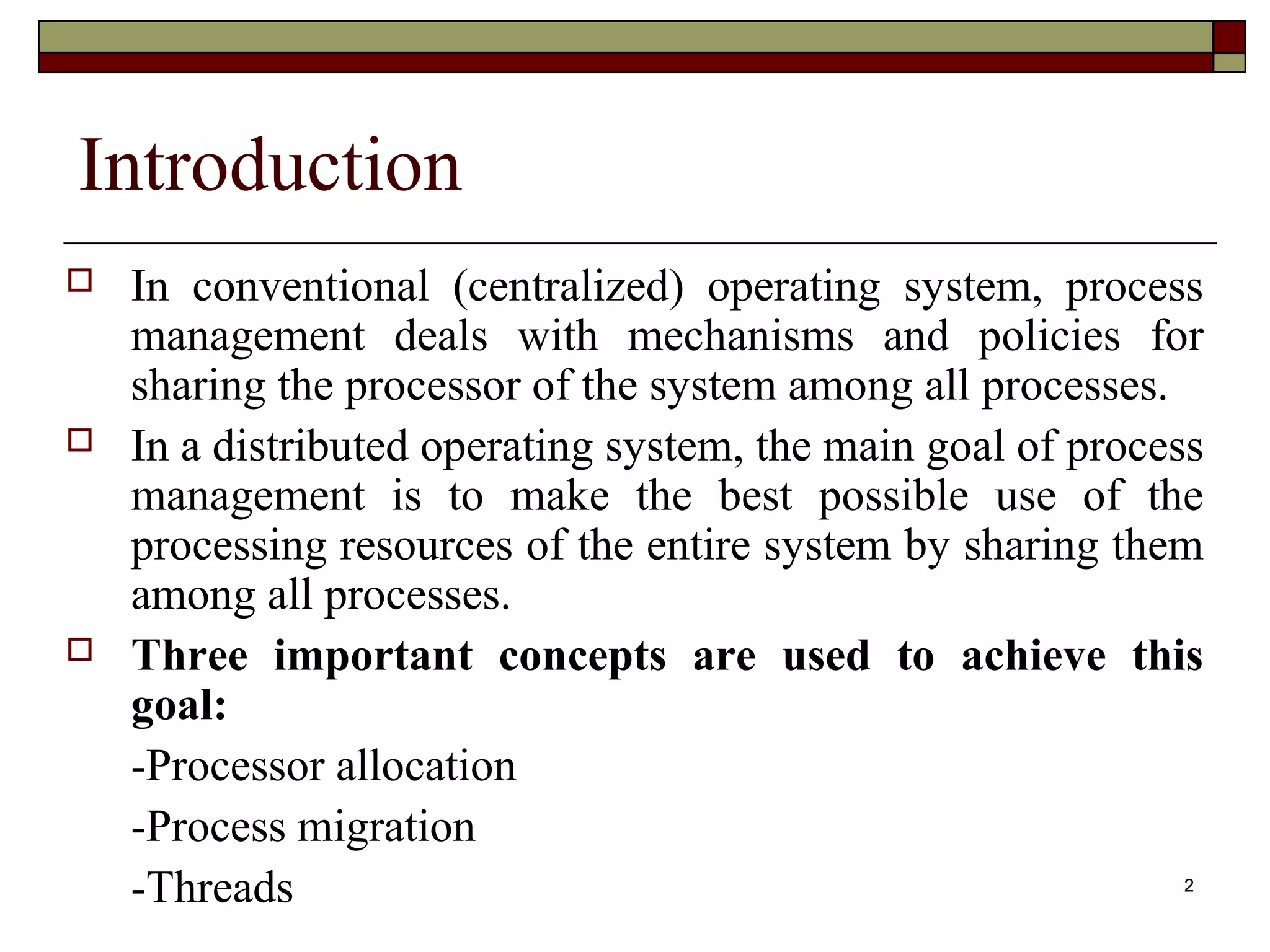 The document discusses process management in distributed operating systems, focusing on process migration which involves moving a running process from one node to another to optimize resource utilization, and covering key aspects like process freezing, address space transfer, message forwarding, and maintaining communication between related processes migrated to different nodes. Efficient process migration requires mechanisms that provide transparency, minimize interference and overhead, and handle heterogeneity between system nodes.