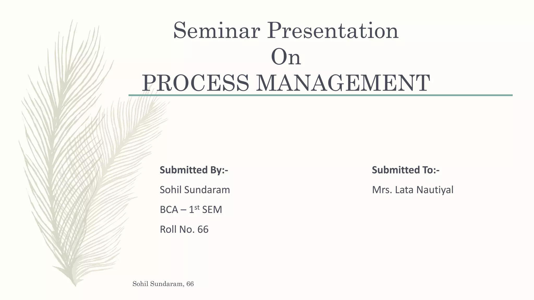 The document is a seminar presentation on process management, detailing the roles of an operating system, the definition of processes, and the need for process management in multitasking environments. It outlines process states, control blocks, scheduling algorithms, and multithreading models, emphasizing the significance of managing processes for optimal resource utilization and execution. Additionally, it discusses various scheduling methods and the issue of deadlocks in resource allocation.