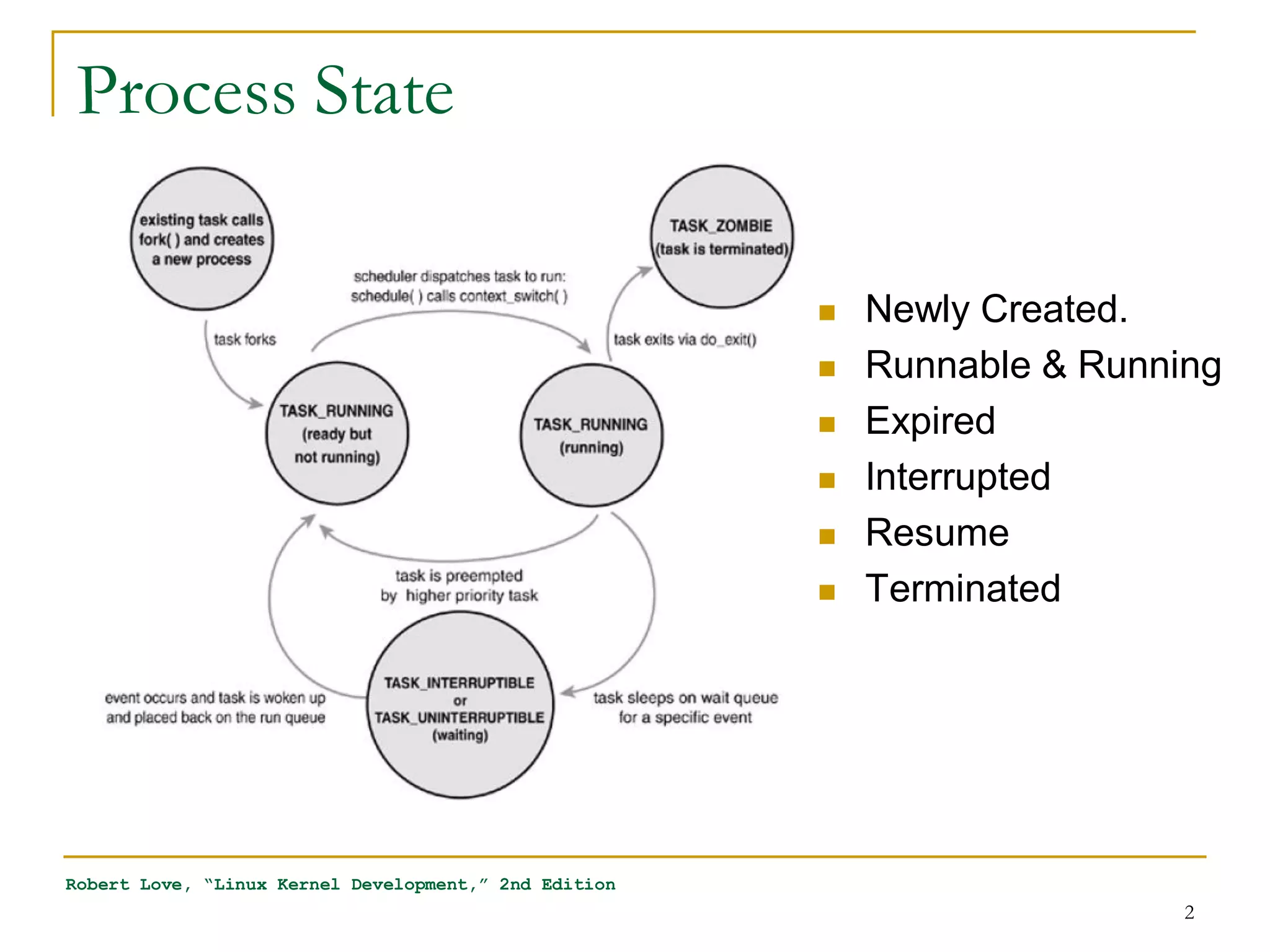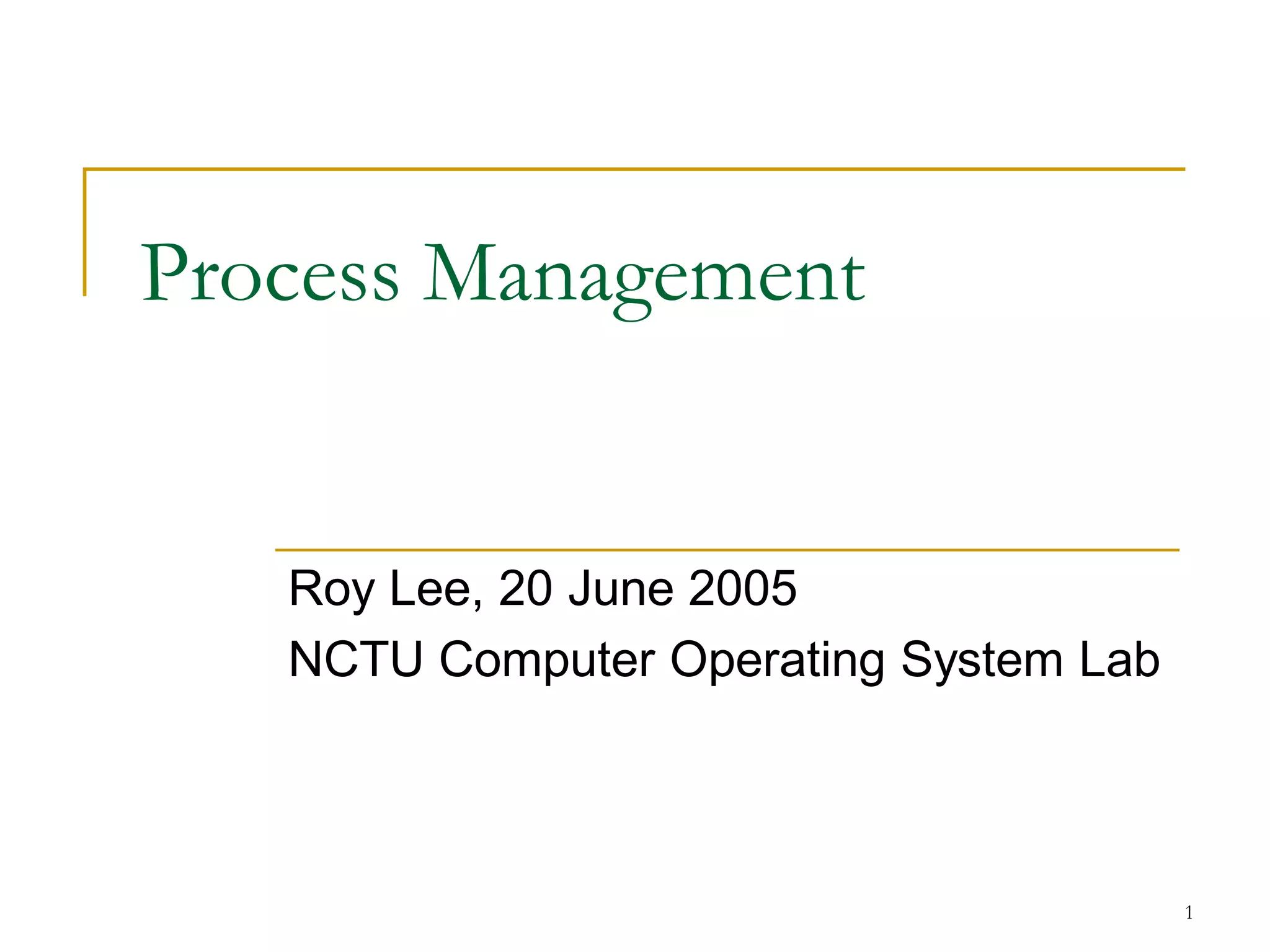 The document discusses process management in Linux operating systems. It describes process states like running, ready, terminated. It explains process creation using fork(), vfork(), and clone() system calls. fork() copies the whole address space while vfork() and clone() can share resources using flags. Copy-on-write is used to delay copying data pages until a process writes to them. A thread is like a process but shares more resources, created via clone(). Process context switches between user mode for applications and kernel mode for system calls.
