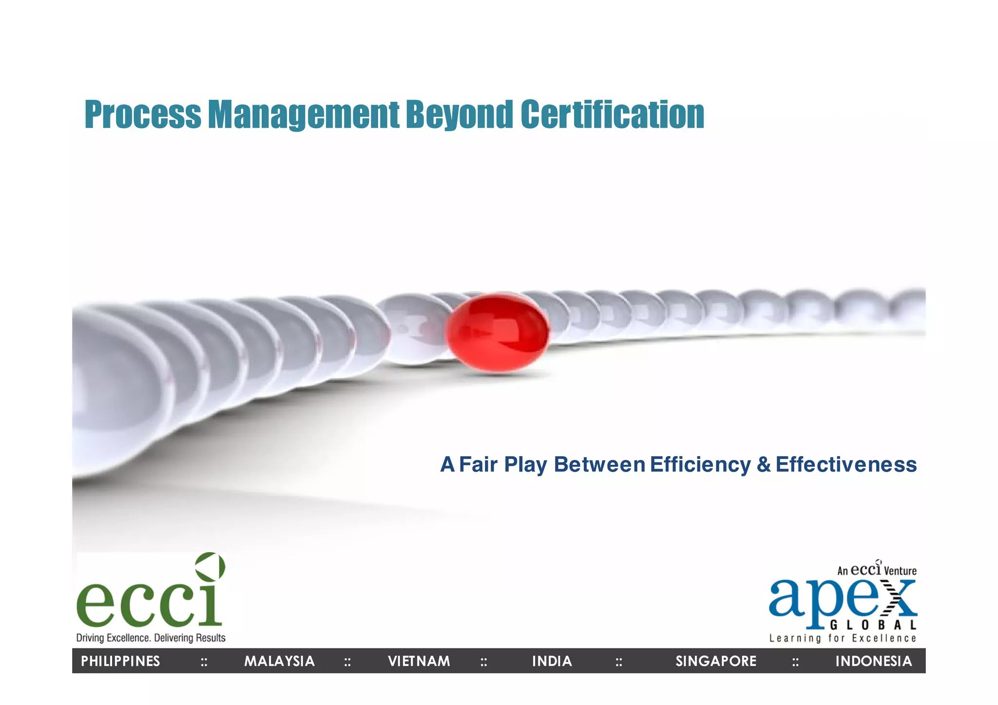 This document discusses process management beyond certification. It explains that process management involves clearly identifying and documenting all steps in a process to manage business workflows efficiently and effectively. While certification provides guidelines and benchmarks, it can restrict companies to just compliance instead of continuous improvement. The document advocates balancing both effectiveness and efficiency in process management for sustainable business success. It presents various models and factors like management commitment, knowledge, and metrics that are critical for effective and efficient process implementation and verification.