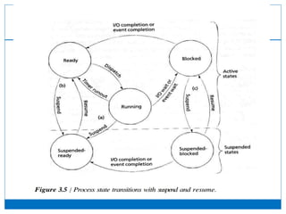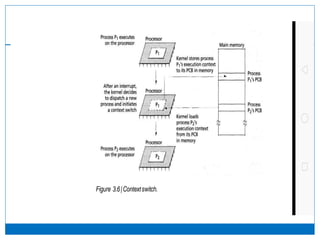 The document provides an overview of process management in operating systems, detailing how processes are created, managed, and transitioned between states such as ready, running, and blocked. It explains the functions of the process control block (PCB) and describes various operations like creating, suspending, and terminating processes, as well as the significance of context switching. Additionally, it covers process communication and the hierarchical relationship between parent and child processes.
