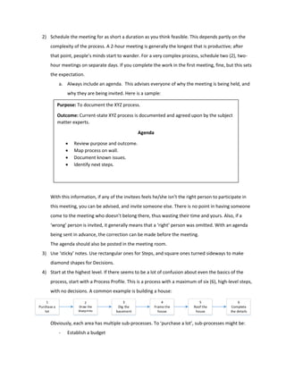 2. Key steps in process mapping include determining stakeholders, scheduling meetings, using sticky notes to map out tasks and decisions, numbering steps, and asking questions to validate the accuracy of the map.