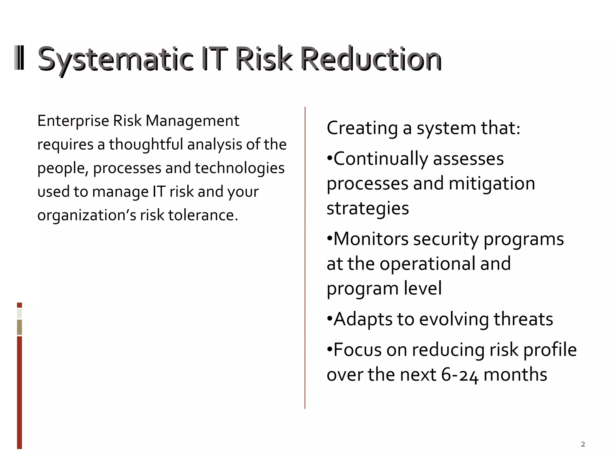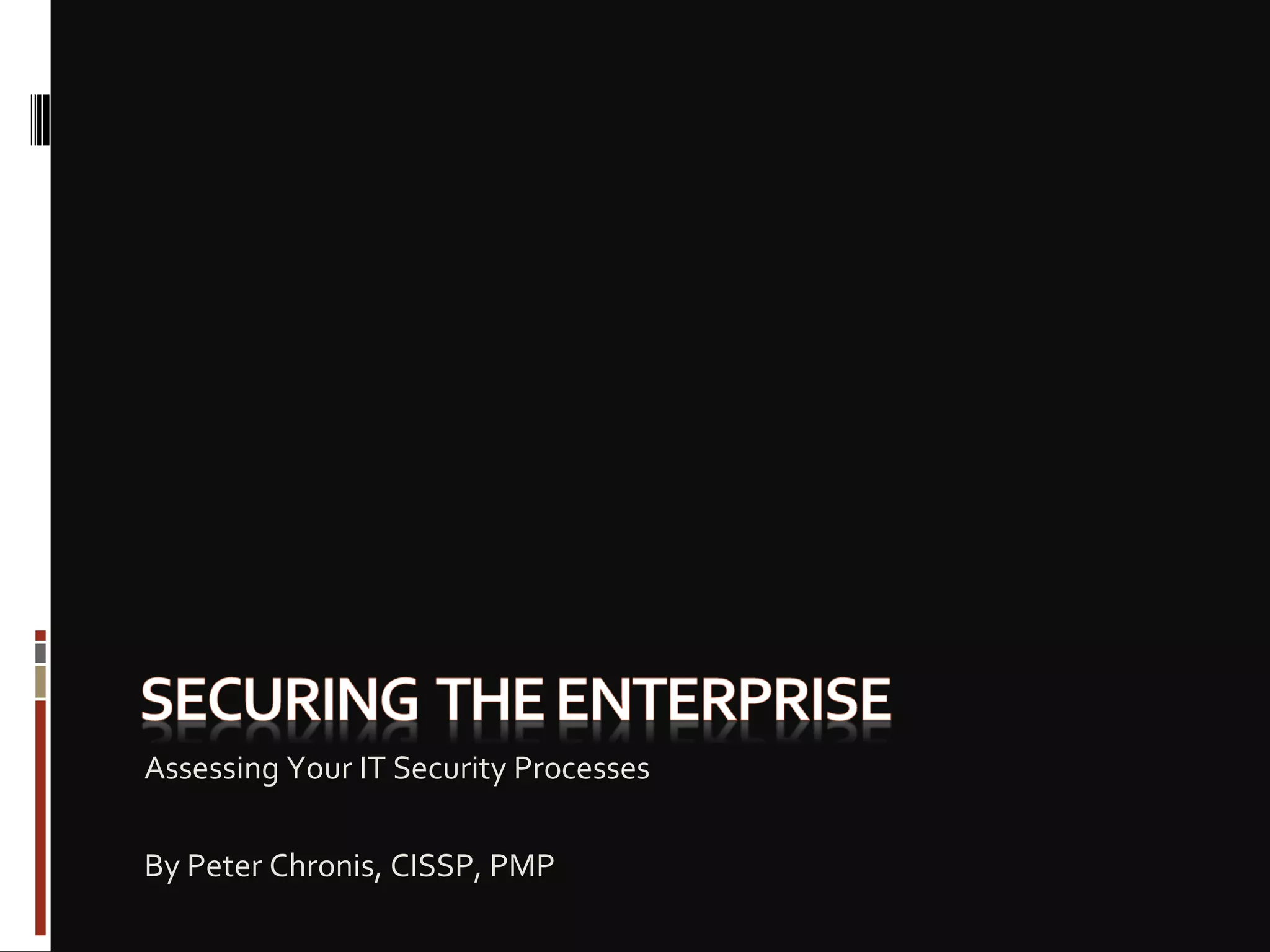 This document discusses assessing and improving IT security processes through a systematic process. It involves continually assessing existing processes, monitoring security programs, and adapting to evolving threats. Key steps include: assessing security processes and rating their effectiveness; identifying gaps; defining a strategy to close gaps; and executing a plan for improvement. Process improvement should be an ongoing cycle to reduce organizational risk over time.