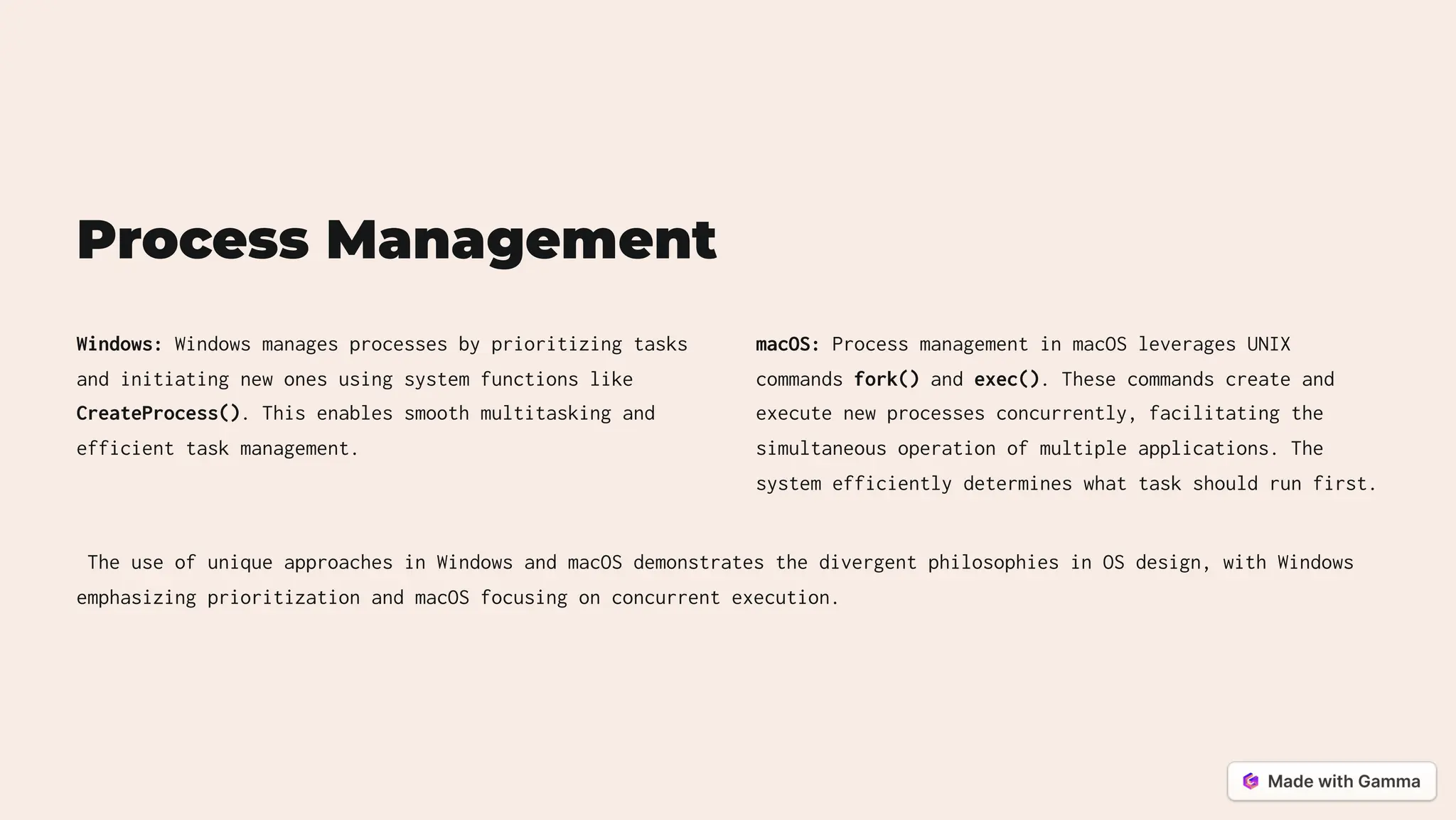 The use of unique approaches in Windows and macOS demonstrates the divergent philosophies in OS design, with Windows