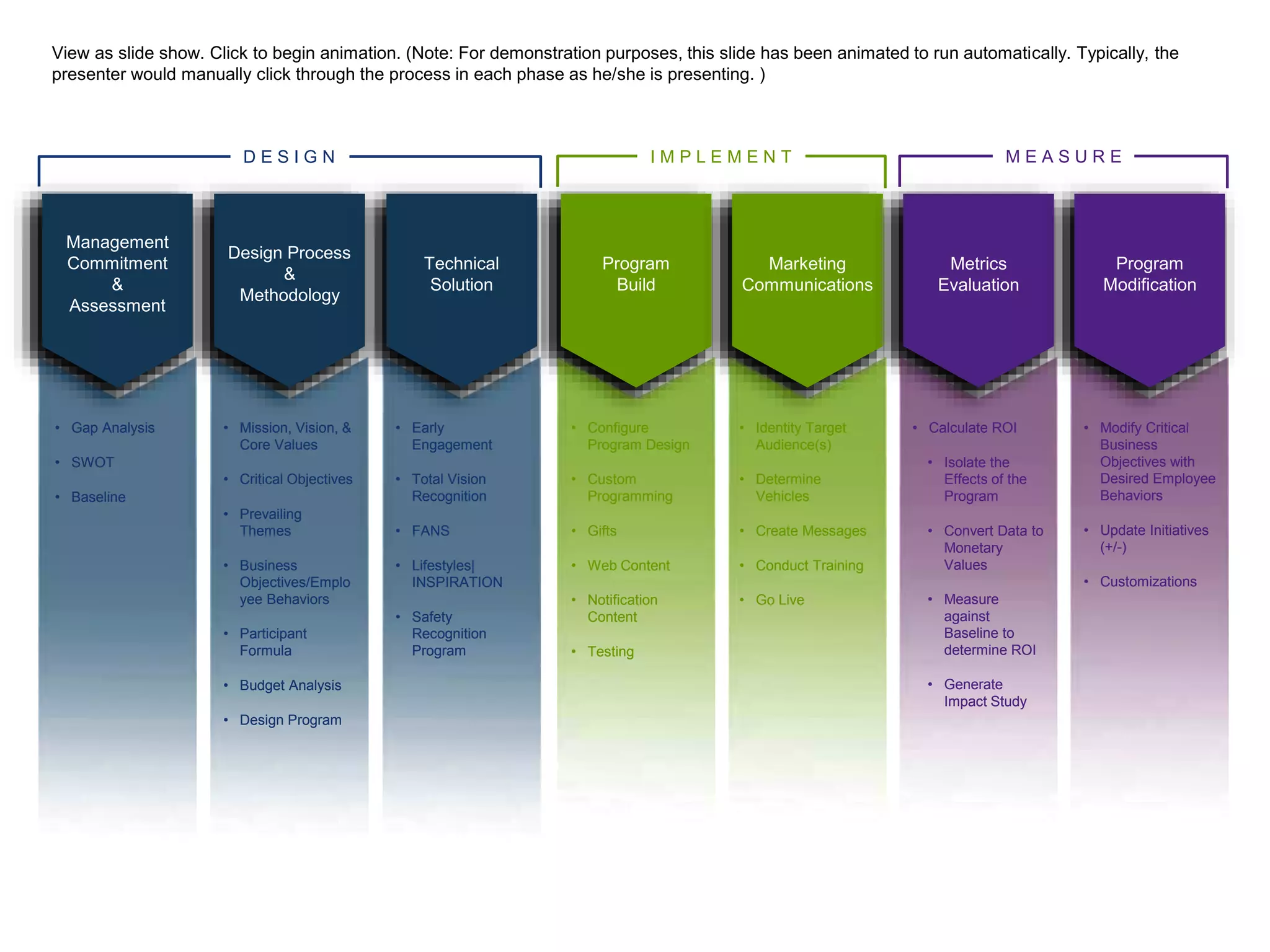 The document outlines a process for designing, implementing, measuring, and modifying an employee recognition program. It involves the following phases: 1) Management commitment and assessment to identify objectives and desired behaviors; 2) Design process and methodology to create the program; 3) Technical solution where the program design is configured; 4) Program build including marketing communications and going live; 5) Metrics evaluation to calculate return on investment; and 6) Program modification based on evaluation results. The goal is to recognize employees and influence behaviors to meet critical business objectives.
