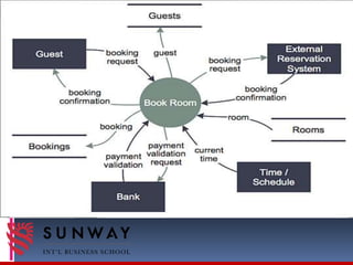 The document discusses process modeling and data flow diagrams (DFDs). It defines process modeling as a technique used to organize and document a system's processes and flow of data through those processes. DFDs are introduced as a type of process model that depict the flow of data through a system using various symbols like processes, data stores, external entities, and data flows. The document outlines the benefits of process modeling and DFDs, provides examples, and describes the basic components, guidelines, and steps for creating DFDs, including drawing a context diagram and decomposing it into level-0 and level-1 DFDs.