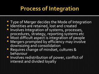 The document discusses several key aspects of mergers and integration. It notes that the type of merger determines the mode of integration and can involve retaining, losing, or creating new identities. Most difficult is integrating people which requires changing mindsets, cultures, and behaviors. It also involves redistributing power and dealing with conflicts of interest or divided loyalties. Proper planning includes conducting culture audits, reducing resentment among top management, and assessing the speed of change and communication clarity needed for real integration. Challenges that can arise include not creating urgency, lacking vision, insufficient communication, and ignoring resistance to change.