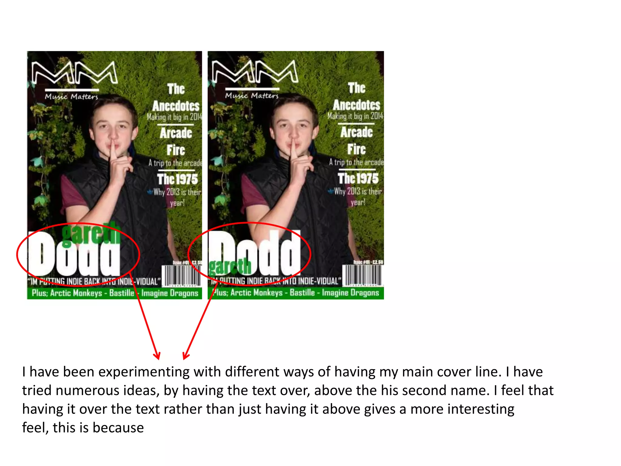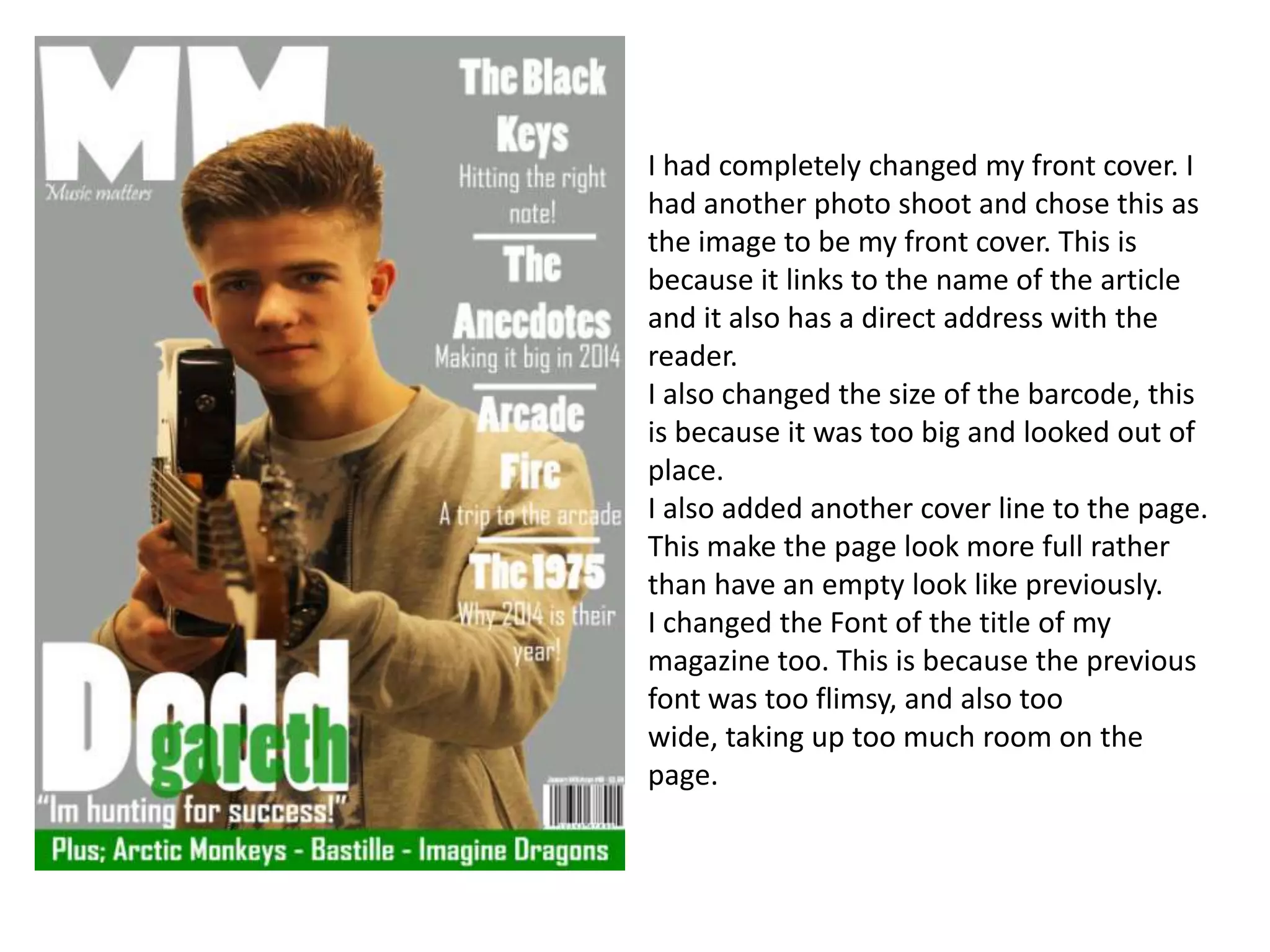 The document describes several changes the author made to their magazine layout and design, including changing the front cover photo and design elements, adjusting text formatting and alignment, modifying column layouts, and redesigning the contents page to look more professional. The changes were made based on feedback and to improve readability, visual appeal, and consistency of style throughout the publication.