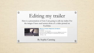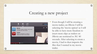 The document discusses the process of editing a movie trailer using iMovie. It explains how to import video clips, adjust clip timing and transitions, add audio and adjust volume, incorporate sound effects, insert titles, and save and share the finished trailer. Key steps include selecting a movie project instead of a trailer, importing files by dragging them into the timeline, adjusting clip lengths by dragging boxes, inserting transitions between clips, adjusting audio volume and fades, adding copyright-free sound effects, including titles for information, and sharing by saving the file.