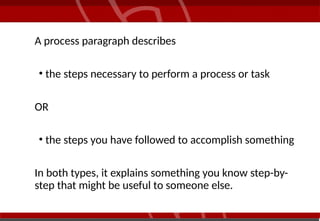 topic sentence in each paragraph. After that, discuss the purpose of the sentences before the topic
