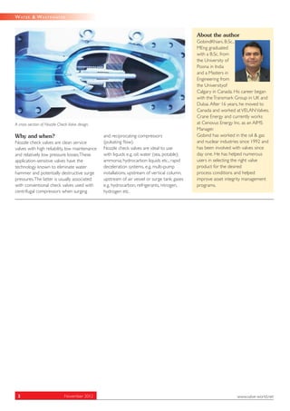 The document discusses the issues of water hammer and slamming caused by swing check valves in process piping, particularly when handling high volumes of flow. It highlights the benefits of using nozzle check valves, which eliminate backflow and provide high reliability with low maintenance, reducing the risks of water hammer. The author, Gobind Khiani from Cenovus Energy Inc., emphasizes the importance of choosing the right check valve design based on the specific application to avoid potential damage.
