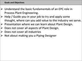 The document provides an overview of fundamentals of process plant design including goals, plant design workflow, process departments and their roles, process flow diagrams, piping and instrumentation diagrams, and common diagram symbols. It discusses key stages in plant design from concept selection through detailed engineering design. It also covers topics like plot plan development, piping studies, piping fundamentals, standards, specifications, fittings, flanges and more. The document serves as an introduction to process plant design concepts and terminology.
