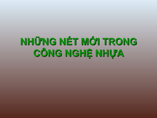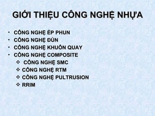 Tài liệu giới thiệu một loạt công nghệ nhựa mới, bao gồm ép phun, đùn, khuôn quay, composite, và pultrusion. Nó cũng đề cập đến các công nghệ ép phun tiên tiến với kích thước micrometer và tạo cấu trúc foam. Tài liệu cung cấp cái nhìn tổng quan về các sản phẩm và quy trình sản xuất trong ngành công nghiệp nhựa.