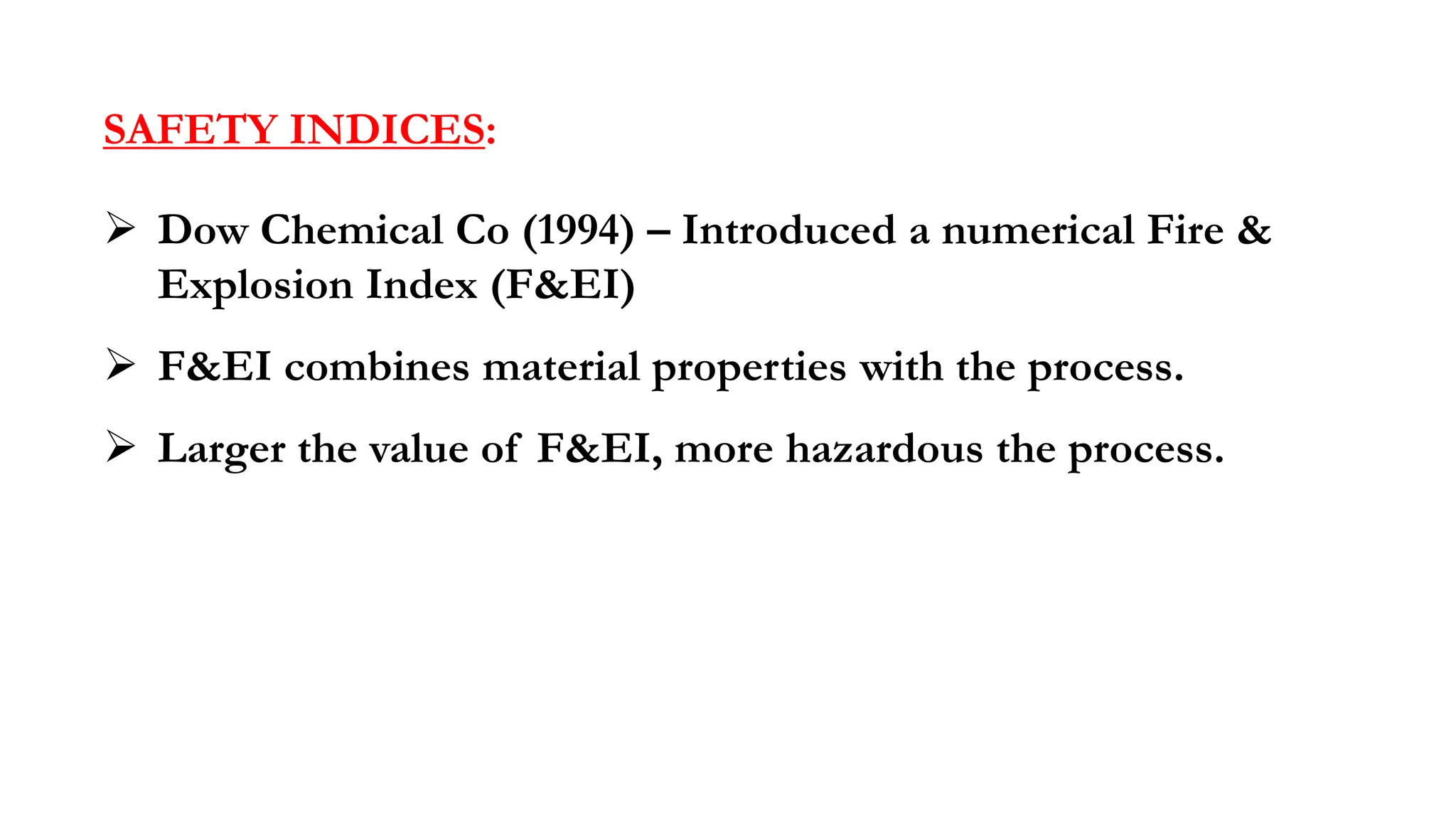 The document discusses Dow Chemical Co's Fire & Explosion Index (F&EI) which combines material properties and process hazards to assess risk. The F&EI is calculated by determining material and process factors then multiplying them. Material factors consider properties like flash point and reactivity. Process factors examine issues like exothermic reactions, enclosed spaces, toxic materials, dust explosions, corrosion and more. The F&EI is used along with estimates of potential loss to evaluate risk.