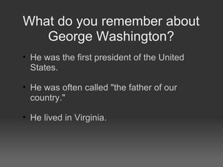 George Washington was the first president of the United States and was known as the father of our country, having lived in Virginia. The next topic will be Betsy Ross, who may have been asked by George Washington to make the first American flag.