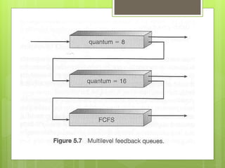 Process scheduling involves assigning system resources like CPU time to processes. There are three levels of scheduling - long, medium, and short term. The goals of scheduling are to minimize turnaround time, waiting time, and response time for users while maximizing throughput, CPU utilization, and fairness for the system. Common scheduling algorithms include first come first served, priority scheduling, shortest job first, round robin, and multilevel queue scheduling. Newer algorithms like fair share scheduling and lottery scheduling aim to prevent starvation.