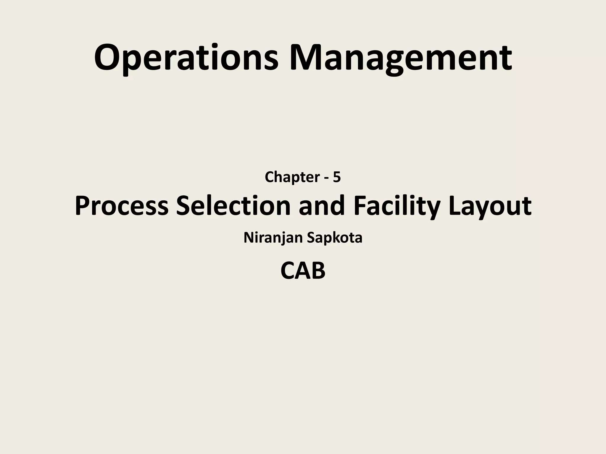 This document discusses process selection and facility layout. It covers product design and how it defines key characteristics. It also discusses process selection as developing the necessary process to produce the designed product. Several factors that affect process design are discussed, including nature of demand, degree of vertical integration, production flexibility, automation, and quality. Different process flow structures like project, job shop, batch, assembly line and continuous are described. The product development process and tools to improve speed to market are outlined. Designing for factors like ease of production, quality and new services is covered. Finally, service process technology based on customer contact and labor/capital intensity is explained.