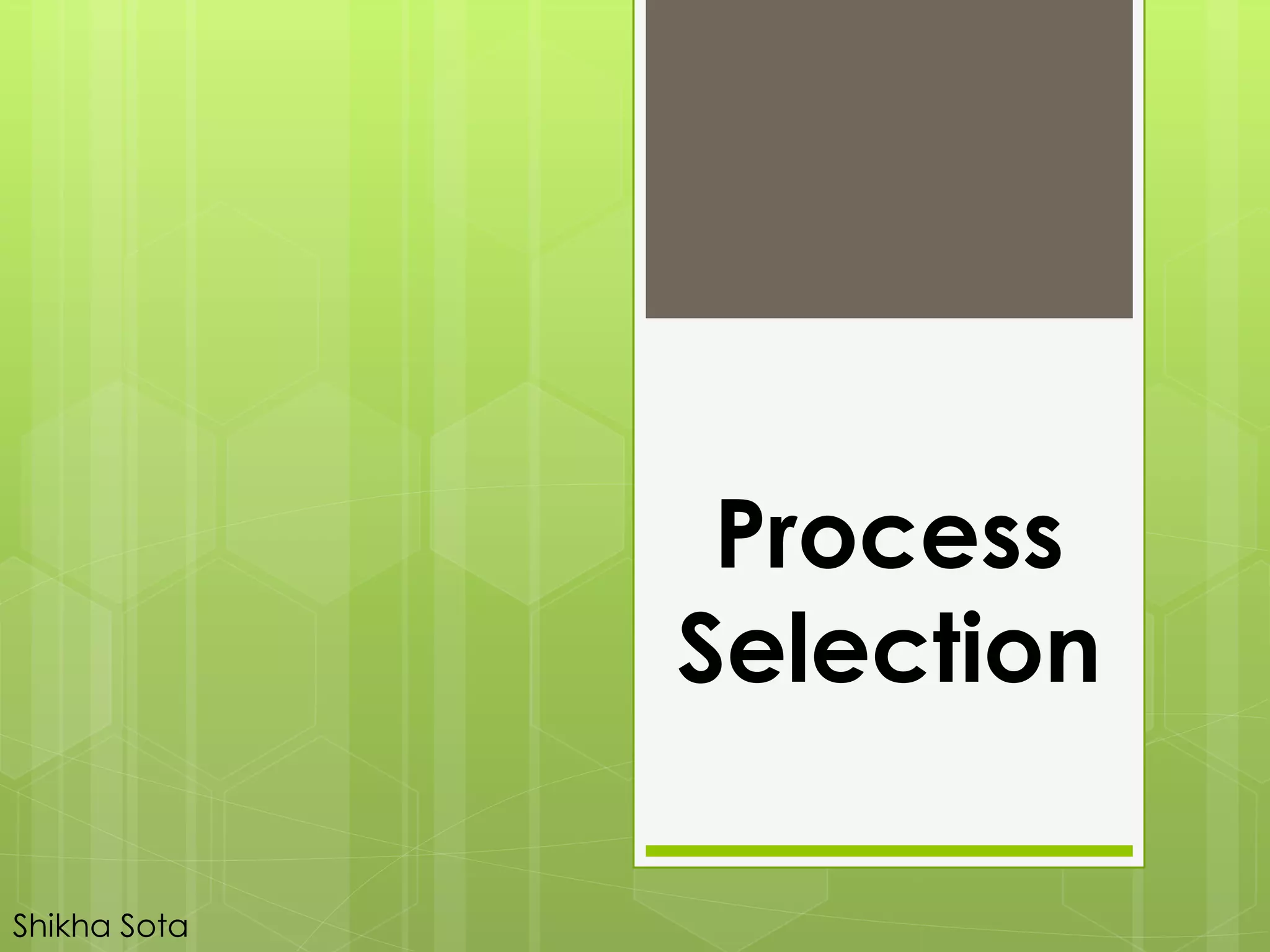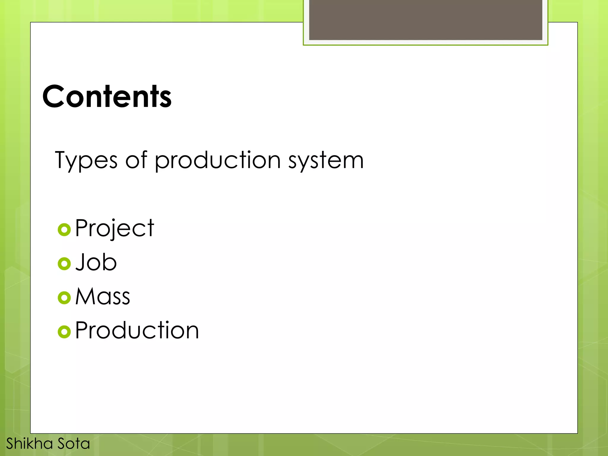 The document discusses different types of production systems and factors that influence process selection. It describes four main types of production systems: project, job, batch, and mass production. It also discusses intermittent and continuous manufacturing systems. Key factors that influence process selection include variety, volume, flexibility, and expected output. Process selection impacts capacity planning, facility layout, equipment design, and work design.