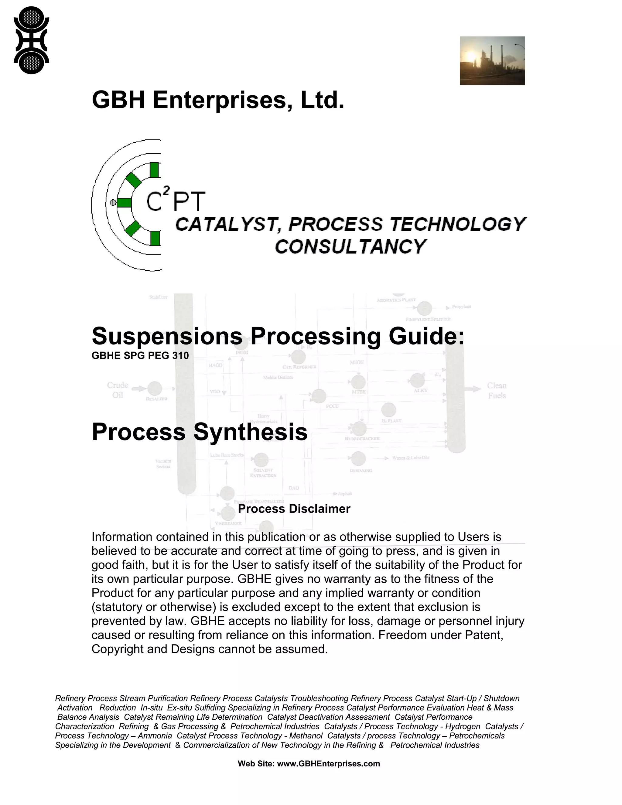 This document is a processing guide from GBH Enterprises, Ltd. that details methods and considerations for refining and petrochemical industries, particularly focusing on the synthesis and evaluation of various catalyst processes. It includes information on solid-liquid separation techniques, troubleshooting procedures, and catalytic performance assessments, emphasizing the importance of optimized process selection based on physical and economic factors. Additionally, it provides case studies on the harvesting of single-cell proteins and the dewatering of specialty latex, discussing the decision-making processes involved in technology selection.
