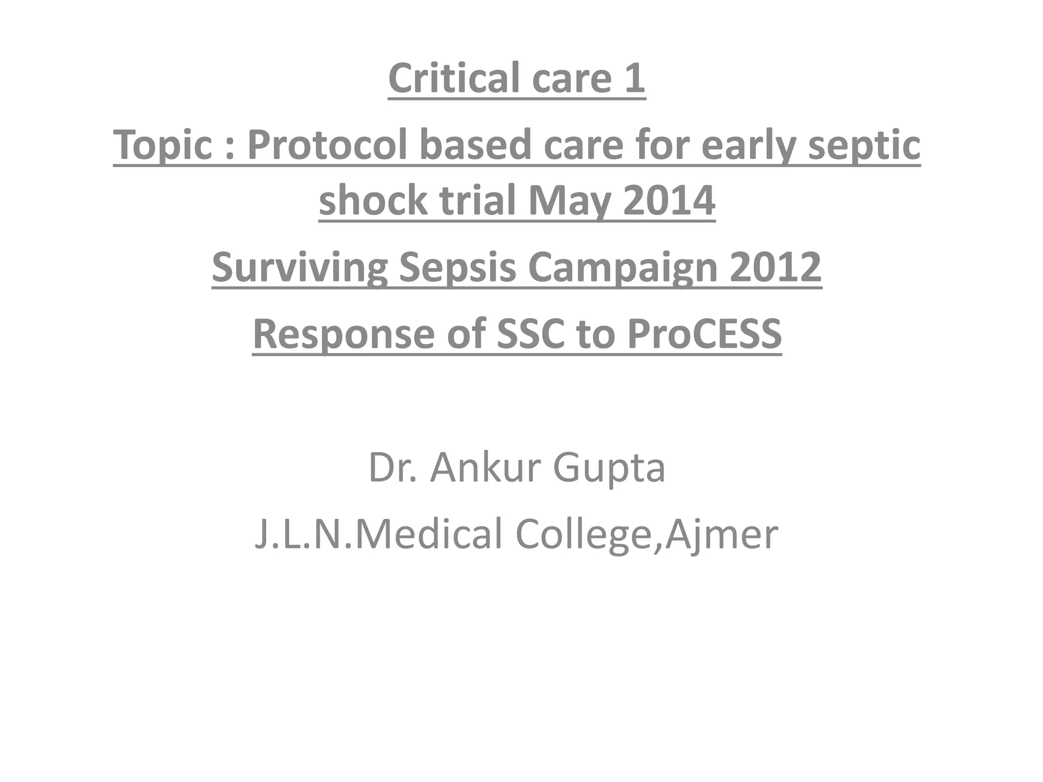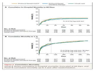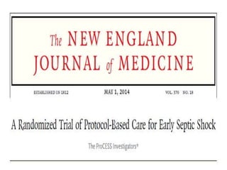 The ProCESS trial found no significant difference in mortality between patients receiving protocol-based early goal-directed therapy (EGDT), protocol-based standard therapy, or usual care for early septic shock. While the EGDT group received fluid resuscitation more consistently, there were no differences in outcomes like mortality, organ failure, or length of stay. This prompted review by the Surviving Sepsis Campaign. They concluded that early diagnosis and treatment remain important. ProCESS did not assess patients with severe sepsis without shock. It also showed improved usual care since 2001, with mortality dropping from 46.5% to 18%, so key bundles should still be followed.