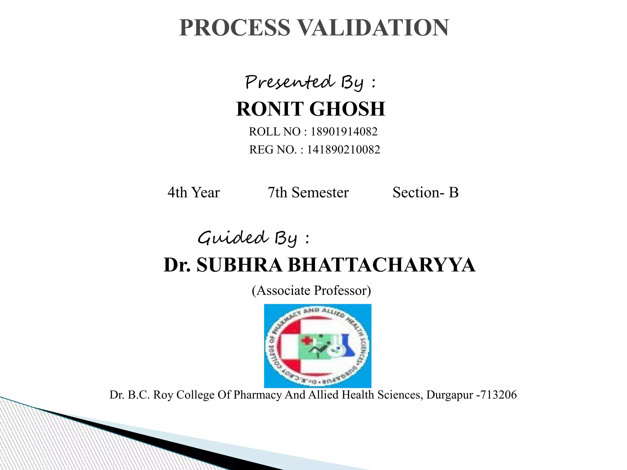 This document discusses process validation. It begins by defining validation as proving that a process leads to expected results and quality products. It notes that validation is needed for new methods, changes to established methods, out of control situations, and comparing methods. The advantages of validation include quality assurance through consistent quality production and process optimization. There are several types of validation: prospective uses pre-planned protocols, retrospective reviews historic data, concurrent involves monitoring, and revalidation ensures changes don't affect quality. In conclusion, validation ensures quality products, equipment qualification, and process optimization and cost reduction.