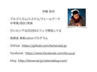 だいたい下北沢OSSカフェで開発してる • 総務省 異能vationプログラム • GitHub https://github.com/llamerada-jp • facebook https://www.facebook.com/ito.yuuji • blog http://llamerad-jp.hatenablog.com/