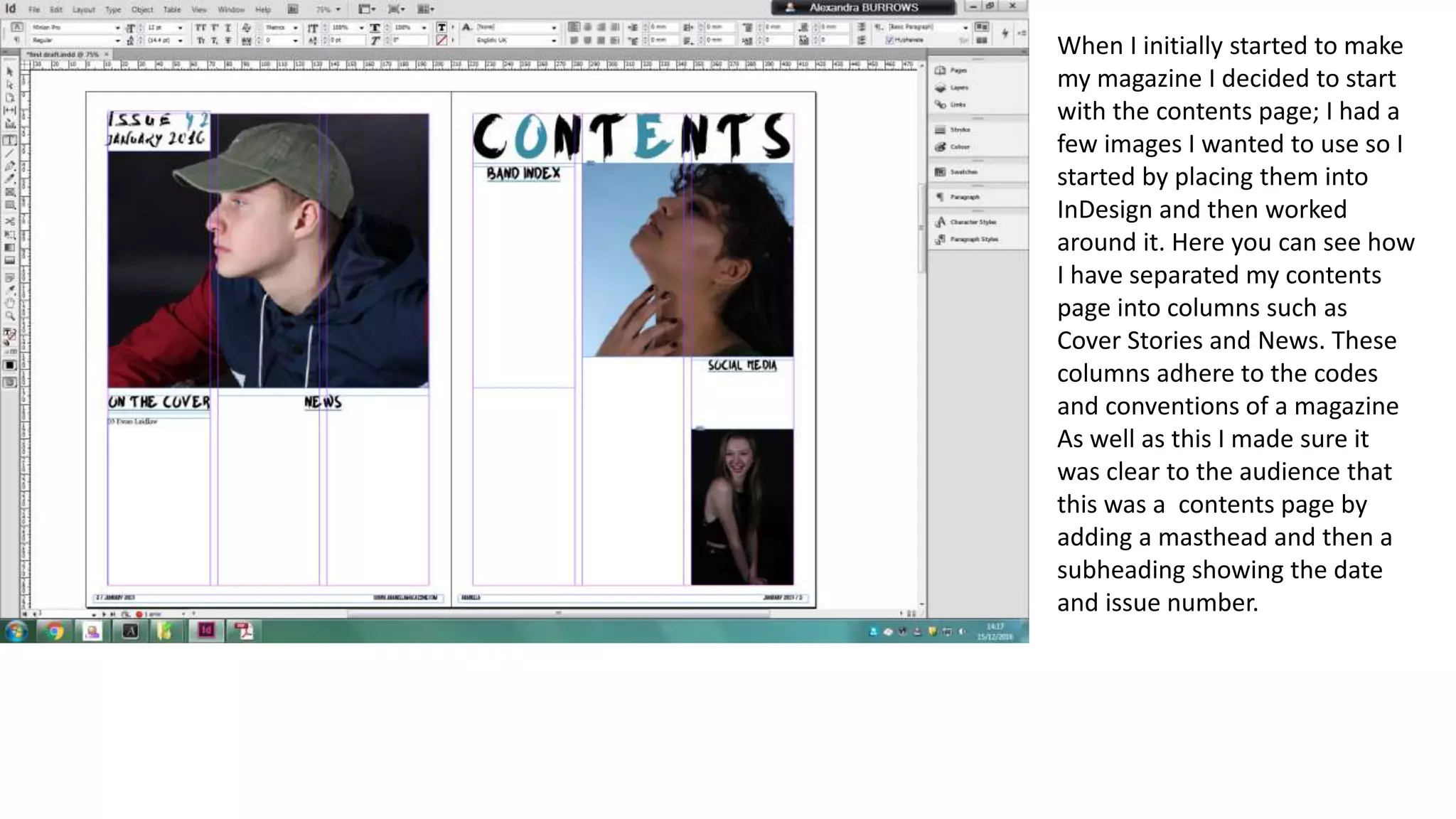 The document describes the process of designing a magazine from start to finish. It begins with creating a contents page by placing images in columns labeled "Cover Stories" and "News." Next, a large headline image and name are used to open the feature article. Another article is added using a full-page image to allow space for text. The contents page is filled out with additional images and page numbers. The feature article is then populated with text, adjusted photos and pull quotes to make it visually engaging. More photos, pull quotes and drop caps are added to complete the article.