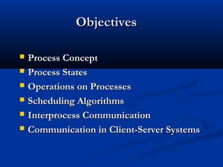 This document discusses process management in operating systems. It defines a process as a program in execution. Processes can be either CPU-bound or I/O-bound. The operating system manages processes through functions like creation, scheduling, and context switching. Processes exist in various states like running, ready, waiting, and terminated. The CPU utilizes scheduling algorithms like first come first served and round robin to allocate processes to the CPU. Processes communicate through interprocess communication mechanisms like message passing and shared memory.