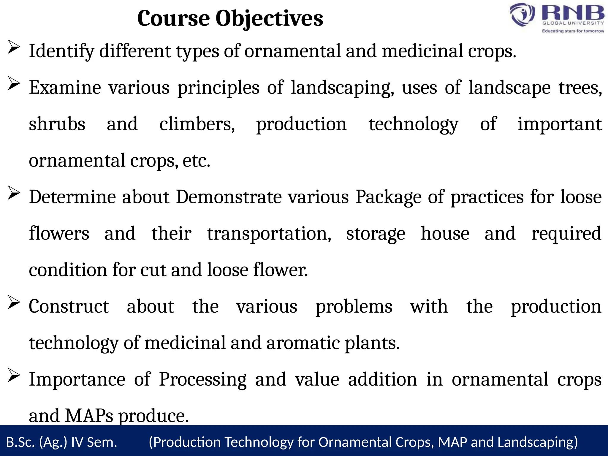 The document outlines a course on production technology for ornamental crops, maps, and landscaping, highlighting objectives such as identifying ornamental plants and exploring production technologies. It covers various drying methods for flowers, including air drying, sun drying, and freeze drying, as well as essentials like bleaching and dyeing techniques. Additionally, it discusses the distillation of essential oils using methods like water distillation and steam distillation to extract aromatic compounds from plants.