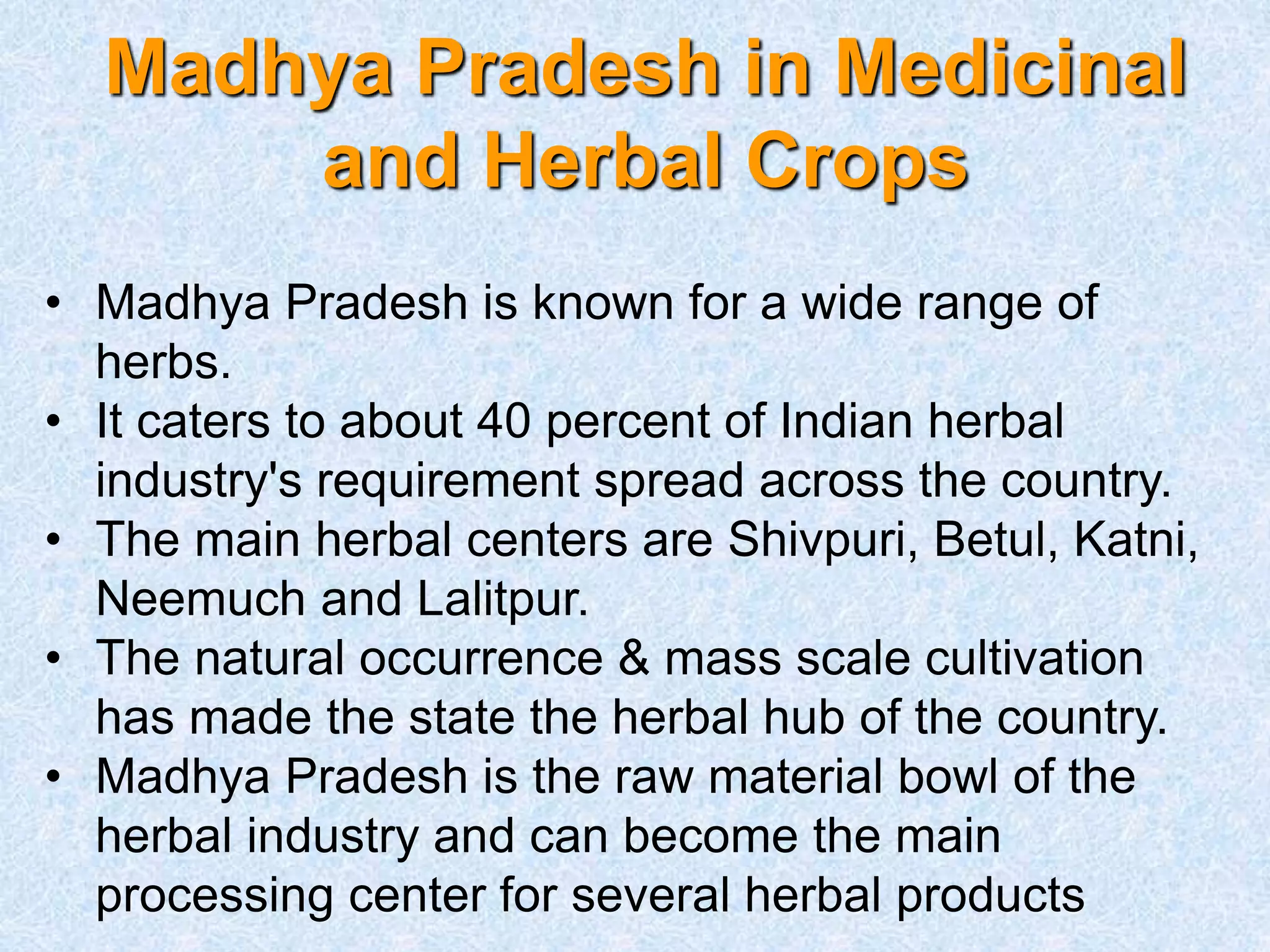 Madhya Pradesh is a major producer of medicinal and herbal crops in India, cultivating over 40% of the country's supply. The state has potential to become a processing hub through establishing facilities and technologies for extraction, drying, size reduction, and producing value-added products from crops. Key recommendations include developing appropriate processing technologies adaptable to rural areas, strengthening R&D institutes with pilot plants, and establishing agro processing centers with custom processing facilities to improve post-harvest handling and increase incomes for tribal collectors.