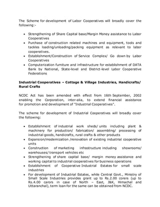 NCDC provides financial assistance for establishing agro-processing units, food grain processing facilities, oilseed processing units, and other processing cooperatives. It also supports service cooperatives involved in agricultural credit, labor, water conservation, animal health, rural sanitation, and agricultural insurance. Additionally, NCDC aids industrial cooperatives focused on cottage and village industries, handicrafts, and rural crafts through establishing production facilities, expanding existing units, constructing marketing infrastructure, and strengthening cooperatives' capital bases.