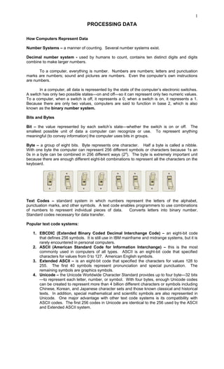 The document explains how computers represent and process data, primarily using various number systems, particularly binary representation. It describes the roles of key components such as the CPU and memory, detailing how they work together to execute instructions and manage data, including different types of memory (volatile and non-volatile). Furthermore, it discusses how processors and various buses facilitate communication within the computer, highlighting advancements in processing technology and the importance of compatibility among different systems.