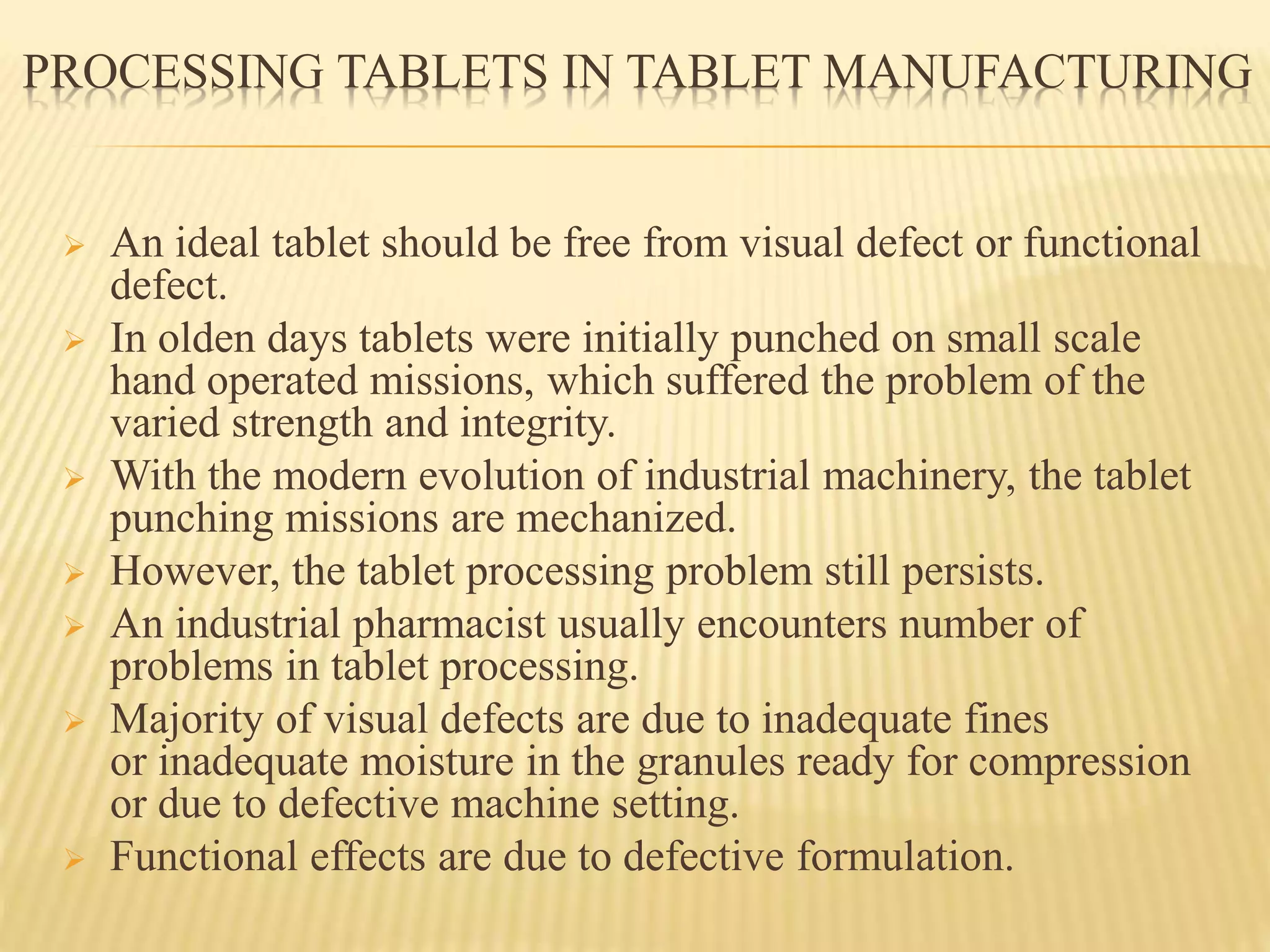 This document discusses common processing problems that can occur during tablet manufacturing and their causes and remedies. Major problems discussed include capping, lamination, picking, sticking, mottling, chipping, and cracking. Capping is caused by air entrapment during compression and can be prevented by proper drying, sufficient binder, and removing fines. Lamination is caused by oily or waxy materials and too much lubricant, and can be addressed by modifying the mixing process and using minimal lubricant. Sticking occurs due to moisture, excess binder, or improper lubrication and drying. Remedies involve drying, lubrication, and modifying granulation.