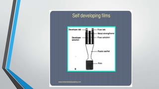The document discusses the process of developing x-ray film from exposure to the final radiographic image. It involves the following key steps: exposing the film, developing the latent image in developer solution, rinsing, fixing the image in fixer solution, washing, and drying. Proper equipment is needed like processing tanks, thermometers, timers, and a darkroom. Both manual and automatic methods are described. Automatic processing is faster but manual processing allows more control over time and temperature variables. Proper handling and disposal of chemical wastes is also important.