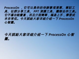 ProcessOn ,它可以是你的待辦事項清單、筆記工 具、社群分享工具、 PPT
