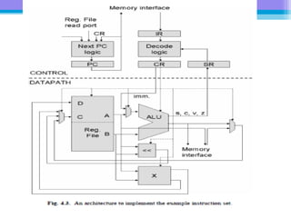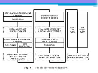 The document discusses the processor design flow, highlighting steps such as capturing requirements, instruction coding, and architecture exploration. It outlines the types of instructions and their encoding methods (horizontal and vertical), along with hardware and software development processes, including ASIC and FPGA design flows. Additionally, various software development models and necessary tools for the development process are briefly described.