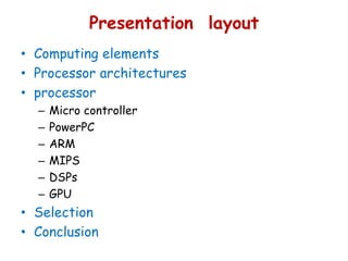 The document provides an overview of various processor architectures, including microprocessors, microcontrollers, DSPs, GPUs, and SoCs, along with their selection criteria. It discusses key architectural concepts such as CISC and RISC, detailing their instruction sets, advantages, and disadvantages. The document also highlights specific architectures like PowerPC and ARM, noting their unique features and applications in modern computing.