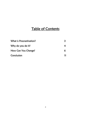 This document discusses procrastination and provides strategies to overcome it. It begins by defining procrastination as putting things off due to laziness or carelessness. Common reasons for procrastinating include fear of failure or success, not prioritizing tasks, and simply not wanting to do something. The document then offers tips to change procrastinating behaviors such as taking inventory of procrastinated tasks, understanding how you personally procrastinate, and creating a productive work environment without distractions. The overall message is that recognizing why and how you procrastinate is key to developing strategies to stop delaying important tasks.