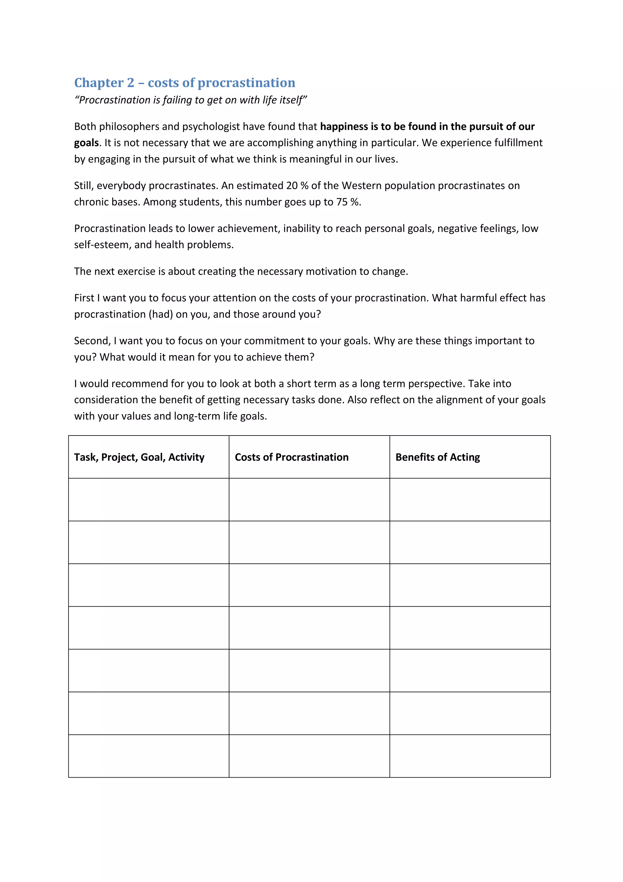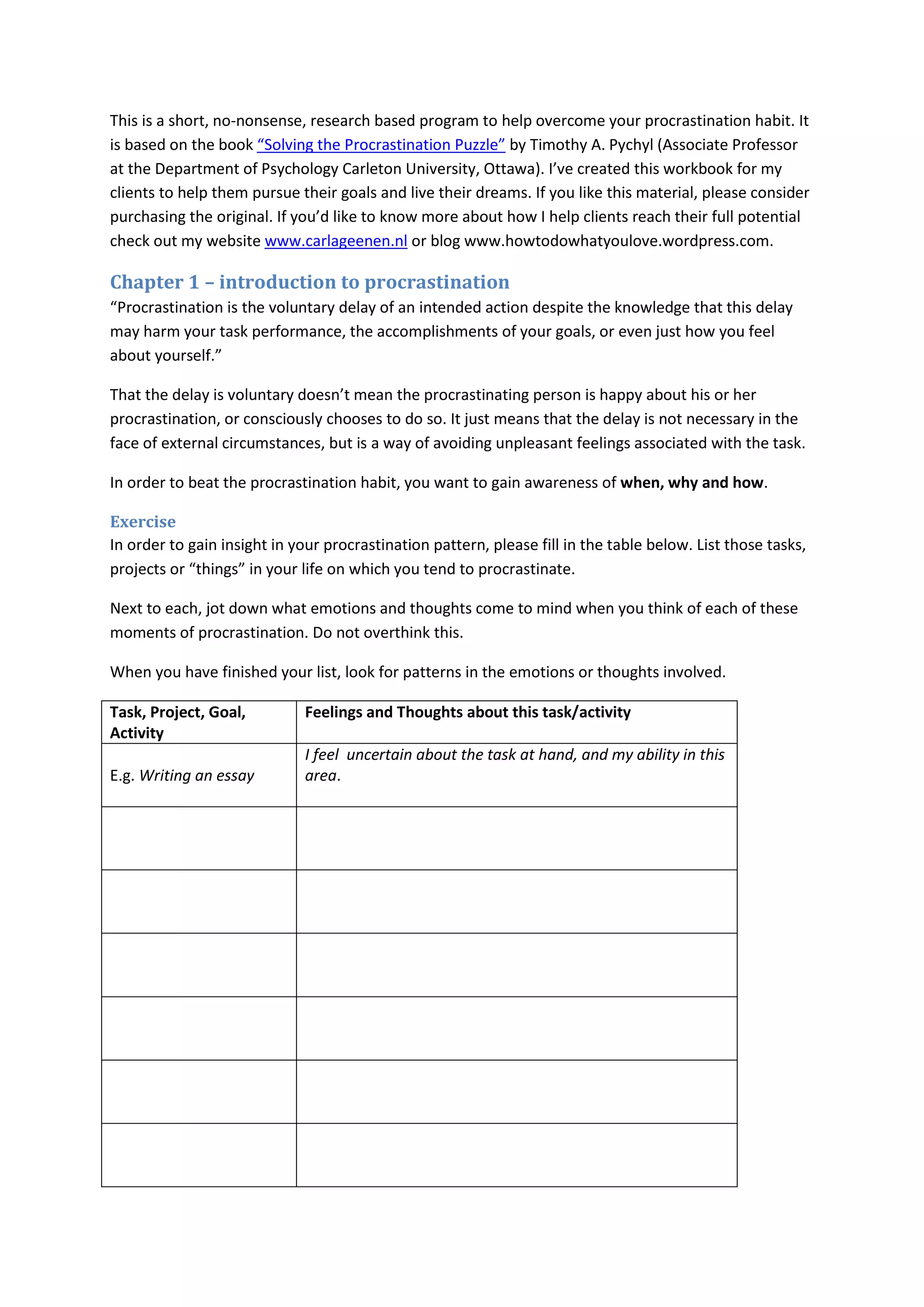 This summary provides an overview of a workbook designed to help people overcome procrastination by gaining awareness of their patterns and triggers for delaying tasks. The workbook discusses how procrastination is linked to trying to avoid negative emotions associated with tasks. It encourages readers to acknowledge their feelings without identifying with them, and to use mantras or "if/then" intentions to regulate their behavior and just get started on tasks despite any reluctance. The goal is to break the habit of procrastination by recognizing tendencies to delay and choosing to act differently each time.