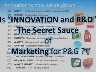 P&G is an American multinational consumer goods company founded in 1837. It pursues international expansion and enters new markets through small-scale acquisitions and trials. P&G's mission in 2010 was to reach more consumers in more parts of the world more completely through continued innovation. It focuses on building business with underserved consumers through consumer-centric, digital, and neuromarketing strategies. P&G also aims to continue growing faster-growing, higher margin businesses with global leadership potential through digital marketing campaigns, emotional and design-driven advertising, and R&D.