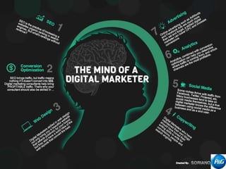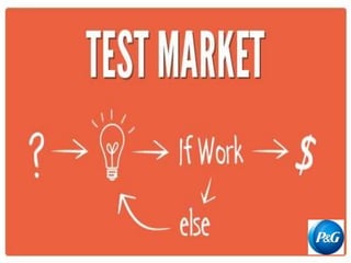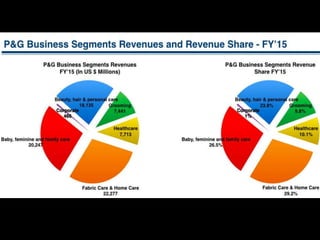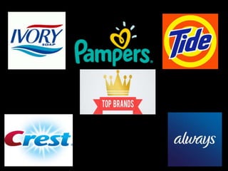 The document discusses Procter & Gamble (P&G), including its founding, product categories, brands, strengths such as product innovation and strong brand image, opportunities such as emerging markets, and threats such as substitute brands. It covers P&G's global expansion, acquisitions, marketing strategies including television commercials, celebrity endorsements, and online forums. P&G's unique marketing approaches and how it has achieved success are also summarized.